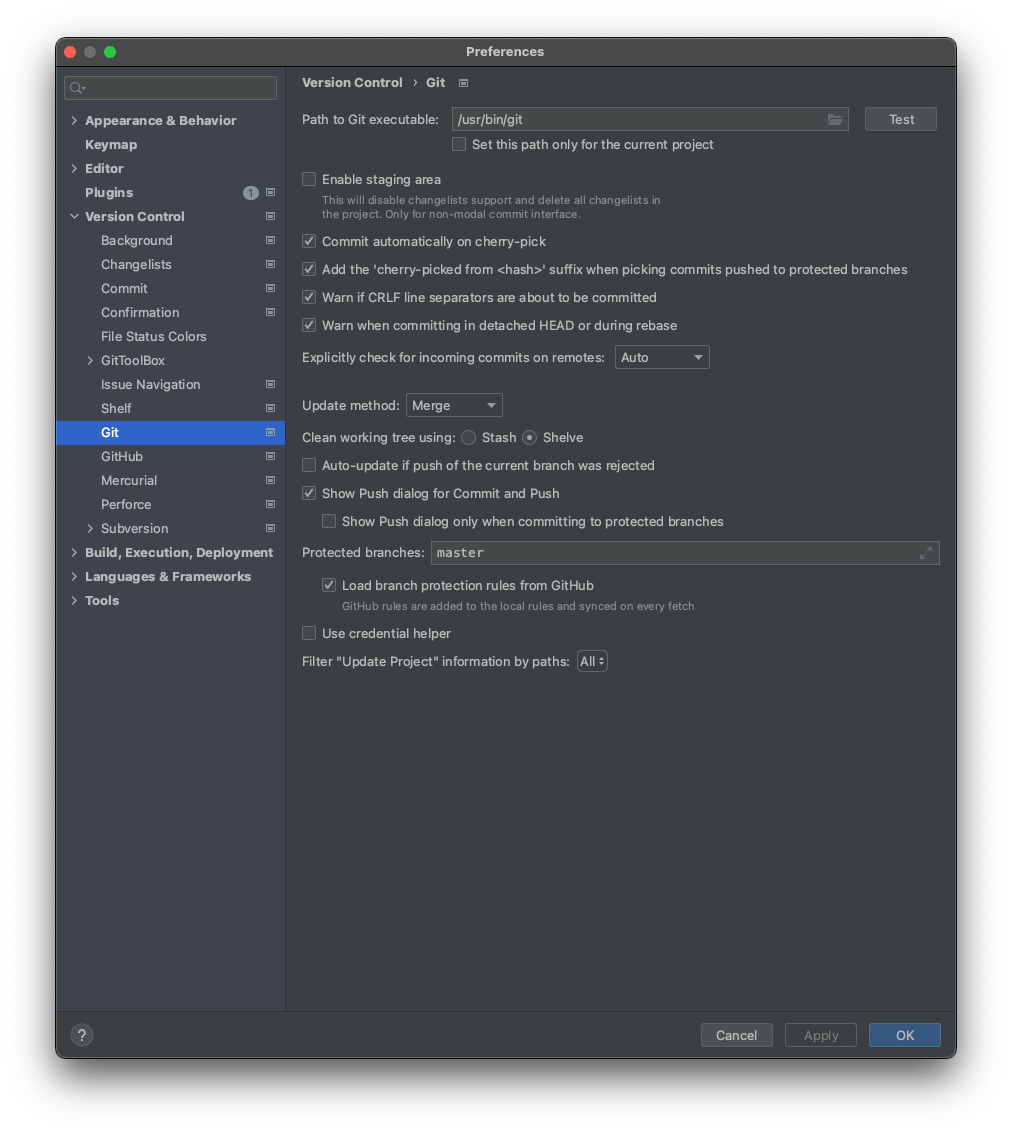 2. ์ธํ ๋ฆฌ์ ์ด ์ค์ -> Version Control -> Git -> Path to Git executable ์ ๊ฒฝ๋ก ๋ณ๊ฒฝ-> Test -> OK