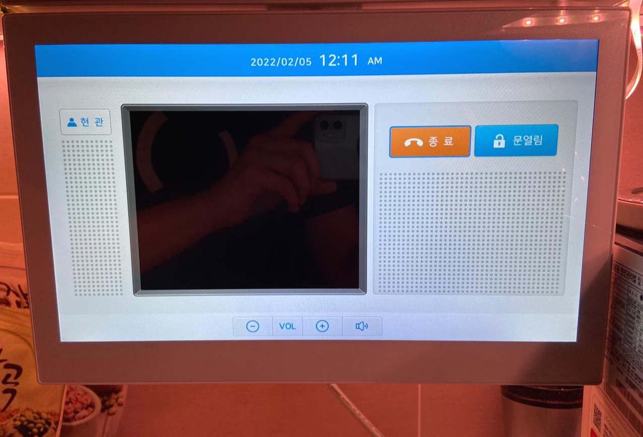 방식은 주방TV 시스템을 통해 사용 한다. 주방 TV에는 공동현관/현관을 여는 기능이 있다.